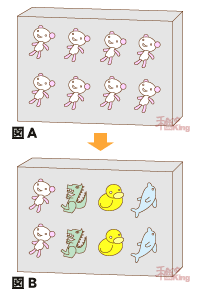従来の量産金型は、図Aのように、同じ商品を並べて製作するのが一般的でしたが、「金型シェアサービス」では、図Bのように、何社かの商品を並べて一括で量産金型を製作するサービスです。